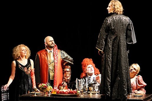 C’est donc au sein de l’actuel que nous recevons aujourd’hui ce texte traduit/trahit par Daniel Mesguich, qui réinvente une poésie, une langue de l’allitération. C’est un voyage linguistique. Par une mise en scène époustouflante, c’est aussi un voyage scénique très riche, proche et en même temps éloigné du classicisme. Ce sont des voyages que nous faisons avec une troupe épatante où la virtuosité de William Mesguich est au service de l’émotion, où les silences au service du sens[1].