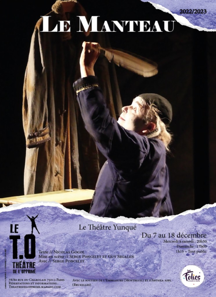 Le Manteau de Gogol au Théâtre de l’Opprimé : Serge Poncelet donne une belle vision de ce texte qui décrit si bien les petites gens, pour un très joli rendu, plein de poésie. Un spectacle dont on savoure le rendu, et dont on sort en réfléchissant.